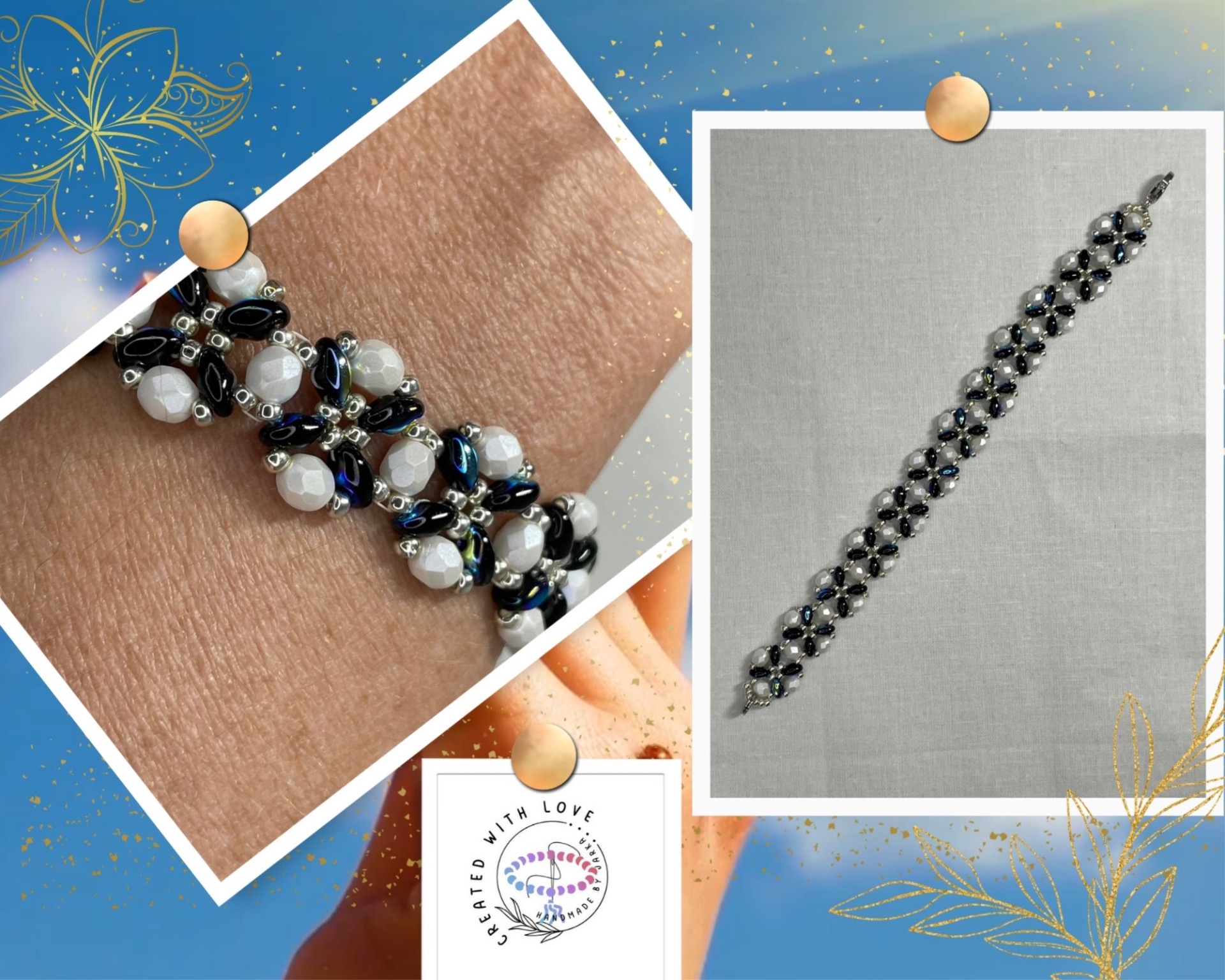 Širší provedení dodává tomuto kousku výrazný charakter a luxusní přítomnost na zápěstí. Stříbrné korálky tvoří opakující se vzor drobných kvítků, které se třpytí jako hvězdy na noční obloze, a jsou propojeny matně černými rocailkami vytvářejícími hluboké, dramatické pozadí. Tento kontrast sytě černé a zářivého stříbra vytváří napínavou hru světla a stínu, která je zároveň vzdušná i záhadná.