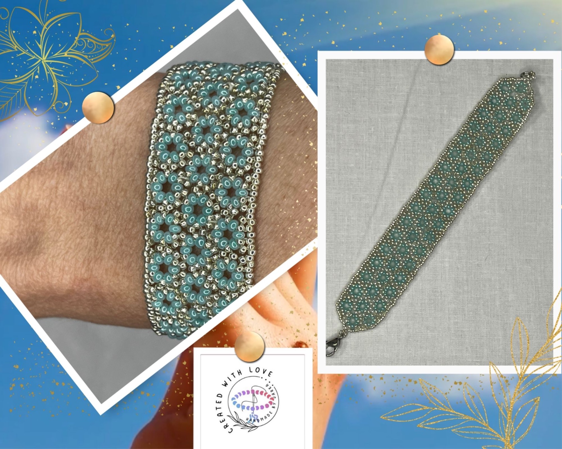 Precizní ruční práce je na tomto náramku vidět na první pohled - každý korálek má své přesné místo, každý kvítek je symetricky dokonalý. Výsledkem je šperk, který vypadá jako by byl vystřižen z krajkové látky, ale přitom má pevnost a trvanlivost korálkového tkaní.