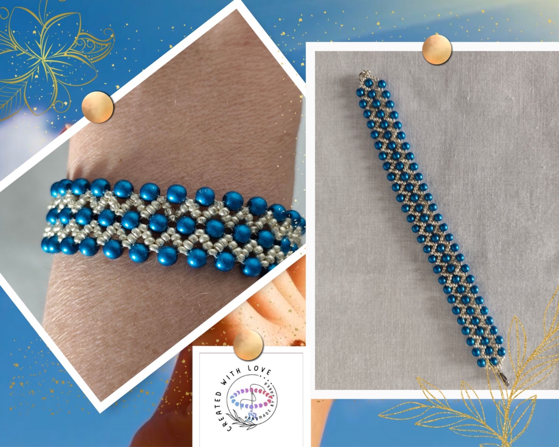 Širší provedení z větších perleťových korálků v intenzivní kobaltově modré barvě s kovovým leskem vytváří výrazný a sebevědomý šperk. Korálky jsou propojeny drobnými stříbrnými rocailkami, které tvoří geometrický vzor připomínající cikcak nebo vlnivé diamanty - tato struktura dodává náramku dynamiku a elegantní pohyb při každém gestu ruky.
